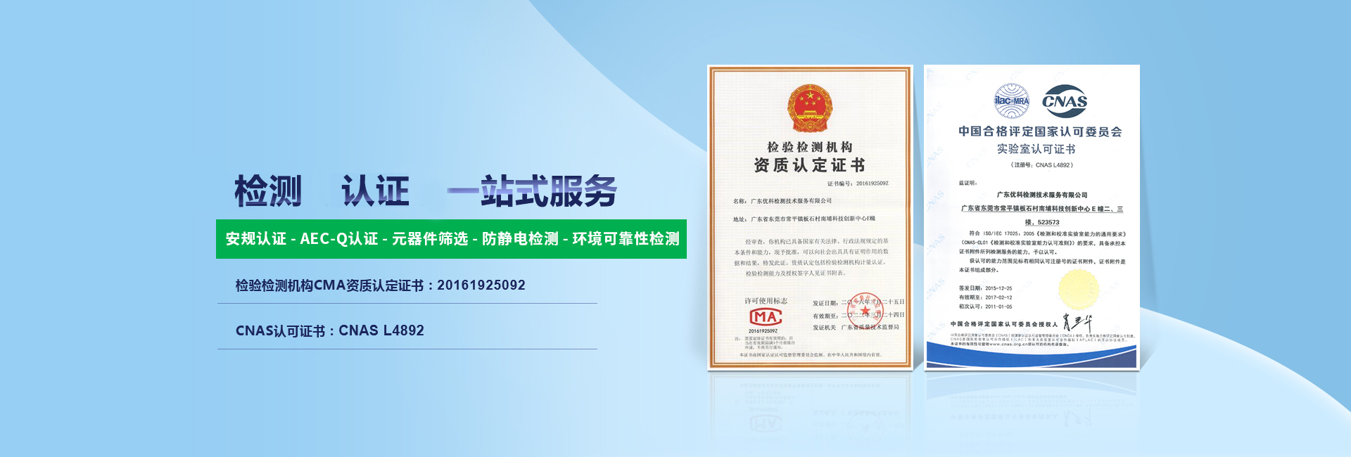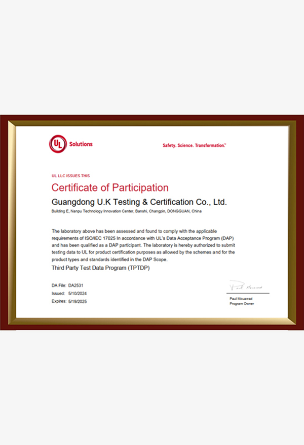 廣東優(yōu)科檢測(cè)認(rèn)證有限公司(簡(jiǎn)稱:UKK)成?于2007年,是國(guó)內(nèi)專業(yè)的汽車整車及零部件、電子元器件第三方檢測(cè)實(shí)驗(yàn)室,國(guó)家級(jí)中小企業(yè)公共(技術(shù))服務(wù)示范平臺(tái),獲得了國(guó)家?新技術(shù)企業(yè)、廣東省專精特新中小企業(yè)、市級(jí)工程技術(shù)研發(fā)中心等榮譽(yù)稱號(hào)。 More